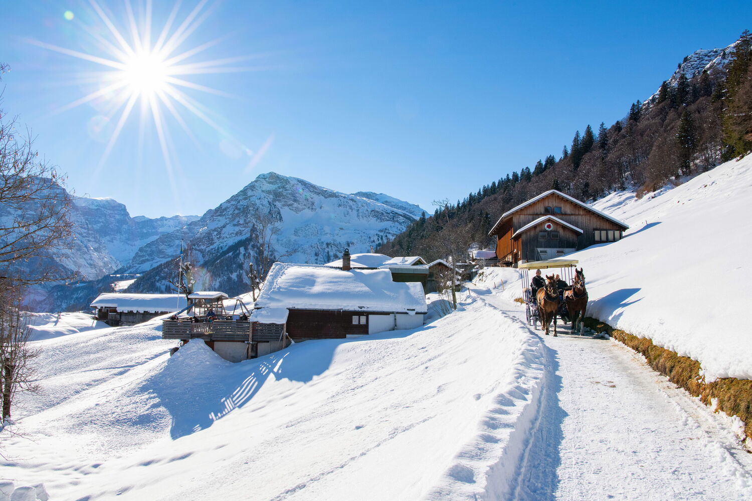 Geniessen Sie eine gemütliche Fahrt mit der Pferdekutsche, vorbei an den weitverstreuten Bauernhöfen im typischen Glarner Baustil, an schmucken Chalets, immer mit der imposanten Bergkulisse als Begleiter. Ein besonderes Highlight ist die Fonduekutsche, ein ganz speziell gemütliches und typisch schweizerisches Erlebnis, dass Sie nicht verpassen dürfen.
