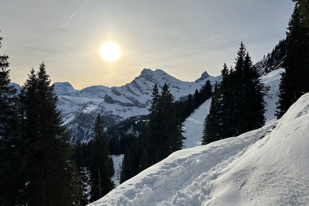 Über Wiesen und durch verschneite Wälder mit einer Höhendifferenz von 150 Metern und einem einmaligem Blick auf das fantastische Glarner Bergpanorama. Nach einem wohlverdienten Rundgang können Sie den einzigartigen Ausblick von unserer Terrasse geniessen.